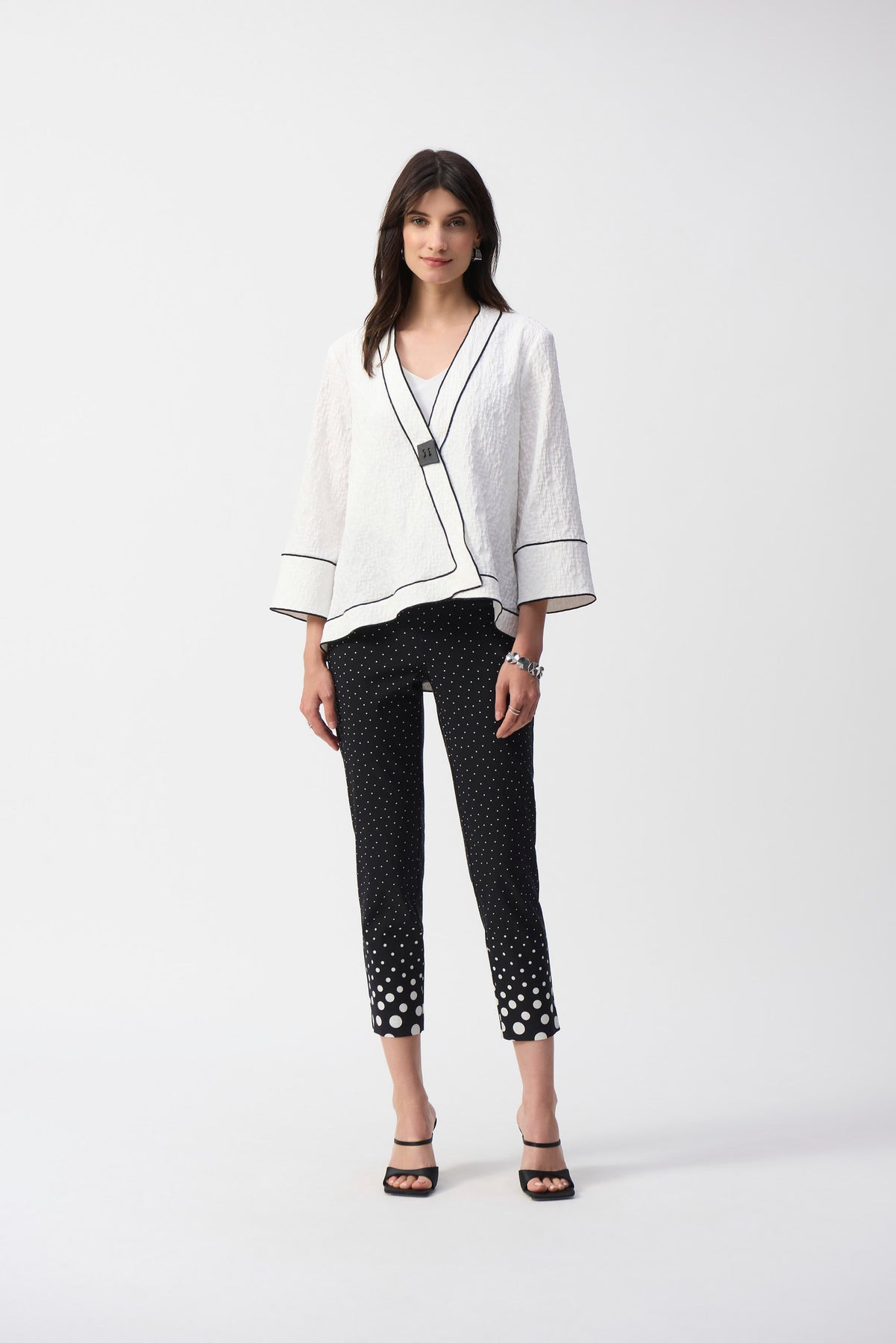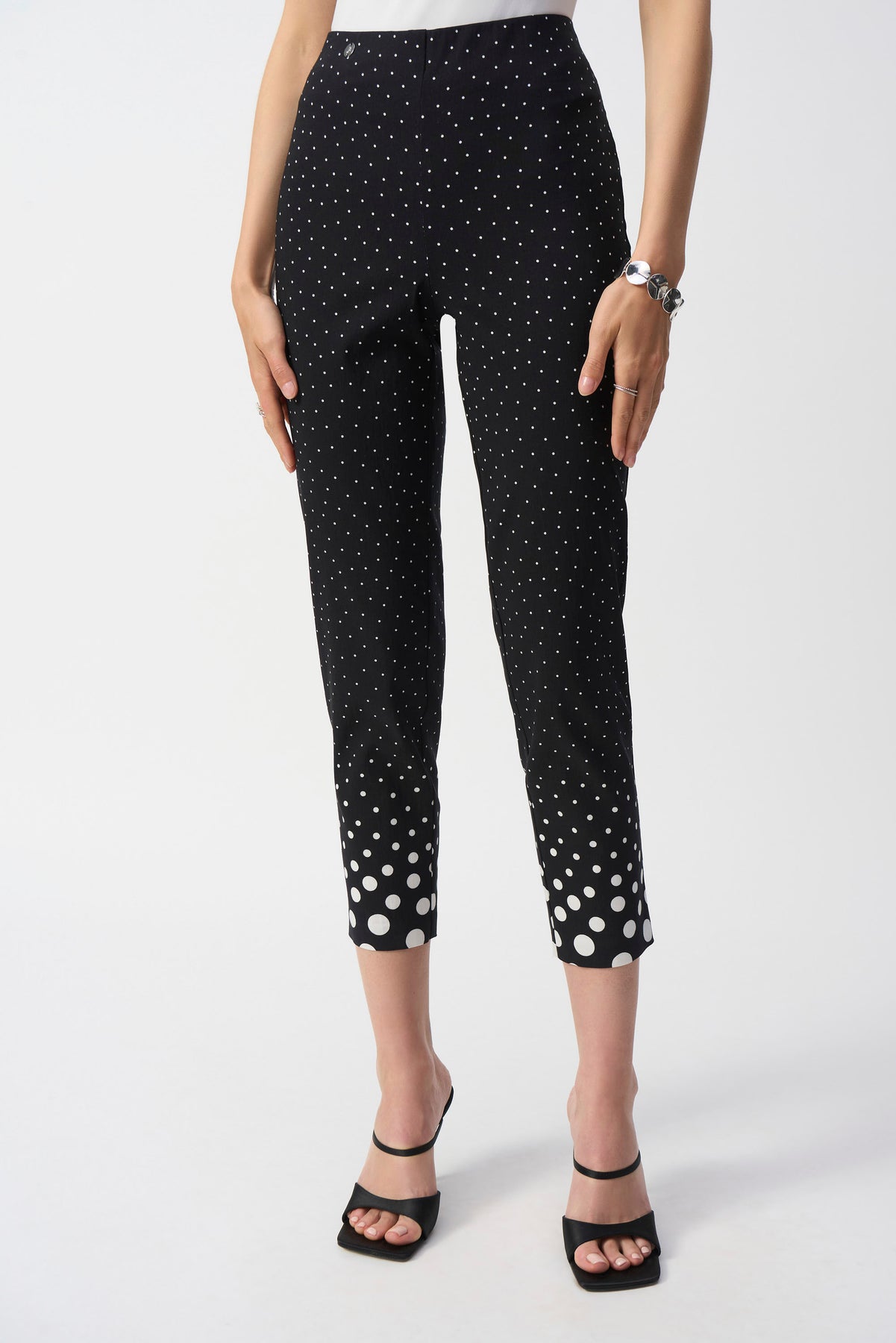Discover the perfect blend of style and comfort with Joseph Ribkoff's slim-fit, cropped polka dot trousers. These mid-rise casual trousers offer a flattering silhouette, making them an ideal choice for any relaxed occasion. The playful polka dot pattern adds a touch of fun, ensuring you stand out effortlessly. Upgrade your wardrobe with these versatile and chic trousers today!
