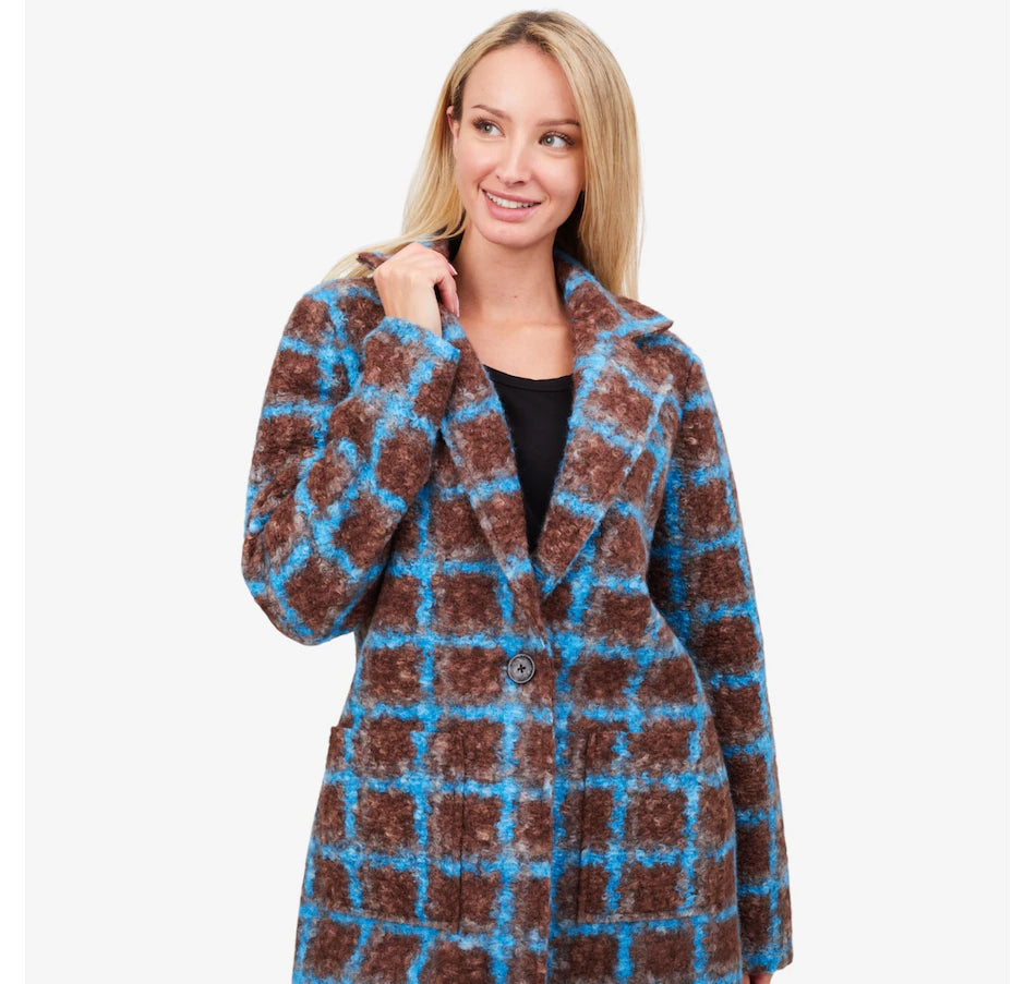 Make a bold fashion statement in this coat, featuring a buttoned front with notch lapels for a refined finish. Long sleeves offer classic coverage, while the front pockets provide both style and functionality. Crafted in a striking boucle plaid, it adds a sophisticated edge to any ensemble.